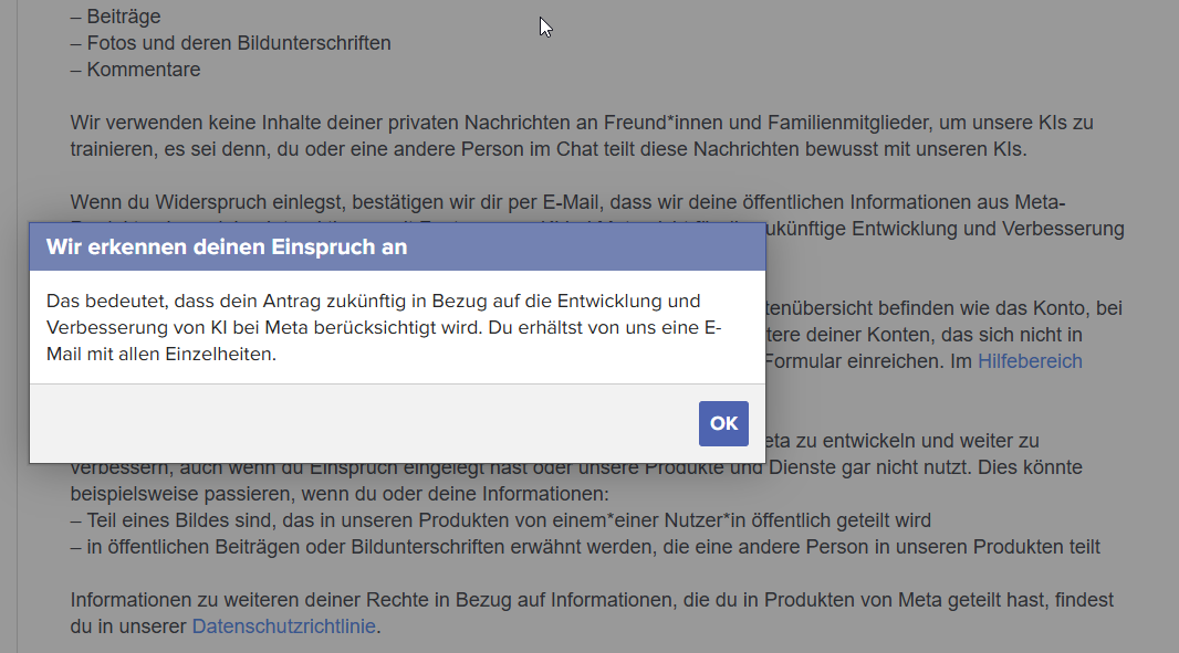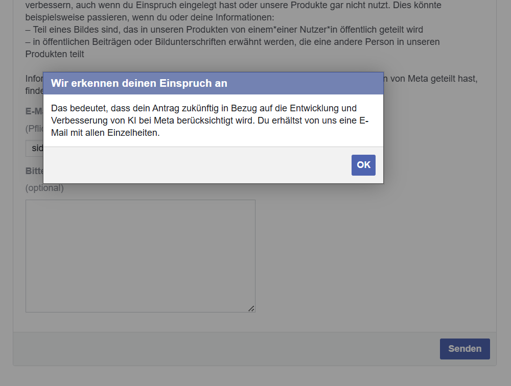 User können über ein Online-Formular widersprechen. Notwendig ist nur deine E-Mail-Adresse, mit der du dein Konto verknüpft hast. Eine Begründung ist optional und nicht erforderlich.